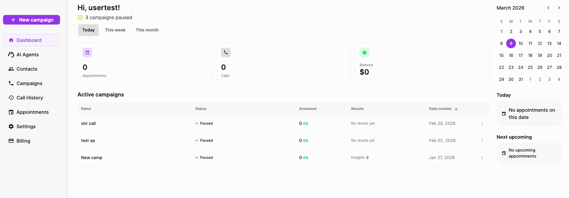 The agent is really customized exactly to, you know, calling like it would be an employee of your own company. And the call behavior, you just set up whether it leaves a voicemail, how many times you wanted to call back, that kind of thing. And then once you set that up, you just come over to the dashboard and you'll see all the campaigns that are running, all the appointments that have been booked into your calendar, all the calls that have been placed.